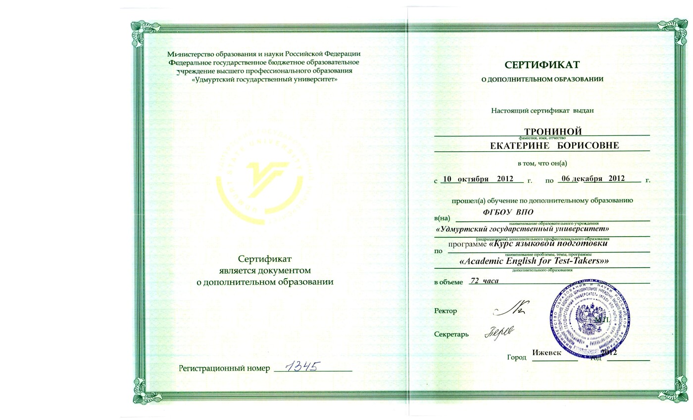• Имеется сертификат о прохождении стажировки в ООО «Интермедиа» - Санкт-Петербургское подразделение Калифорнийской компании - разработчика облачных технологий.